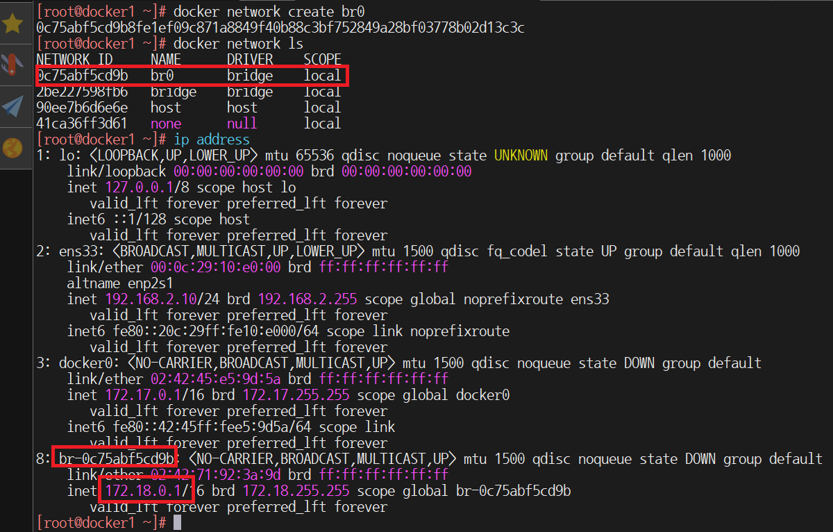 * 컨테이너를 br0번 연결했다가 br1로 바꾼 후에 network 연결 해제, br0, br1 삭제 후