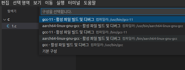 6. aarch64-linux-gnu-gcc - 활성 파일 빌드 및 디버그 클릭. (두 번째 항목 클릭, 네 번째 항목 클릭해도 상관 없음.) [사진 3]