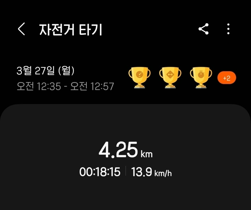 일상/운동 운동 기록[1] (230326 ~ 0401) by bestchoco 2023. 4. 2. - 월, 목 휴식 1. 3월 26일 (일) - 자전거 2. 3월 28일 (화) - 2km 달리기 3. 3월 29일 (수) - 3km 달리기 4. 3월 31일 (금) - 자전거 5. 4월 1일 (토) - 자전거 공유하기 게시글 관리 JUST DO IT '일상 > 운동' 카테고리의 다른 글 24.10.30 3km 러닝 (0) 2024.10.30 오늘의 달리기 230616 1.5km (0) 2023.06.16 자전거 타기 11.77km 230524 (0) 2023.05.24 관련글 24.10.30 3km 러닝 오늘의 달리기 230616 1.5km 자전거 타기 11.77km 230524