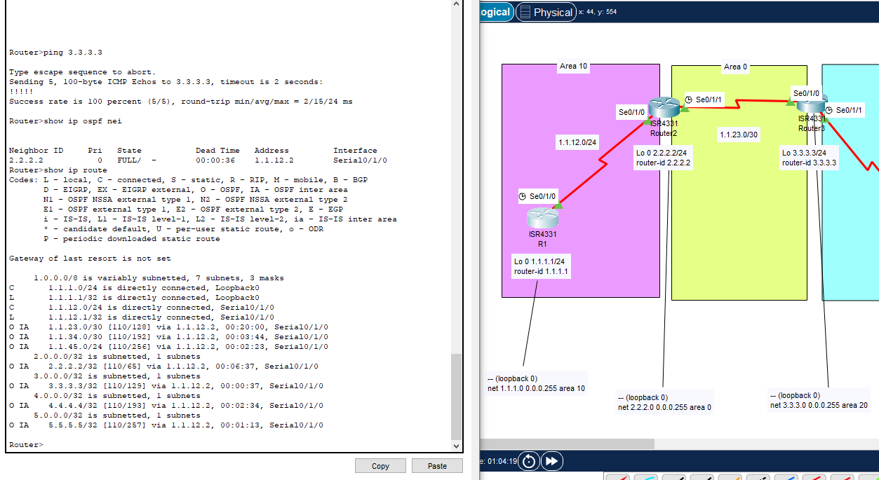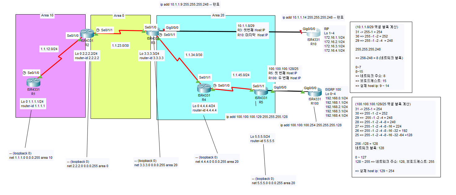 자격증공부/CCNA CCNA - 230513 - 4주차 토요일[2] bestchoco 2023. 5. 13. 13:35 1. area 설정 2. ping 3.3.3.3 테스트 및 IA 정상적으로 넘어왔는지 확인. 3. 최종 세팅 (단, RIP -> OSPF와 EIGRP -> OSPF로 가는 설정값은 미설정한 상태.)